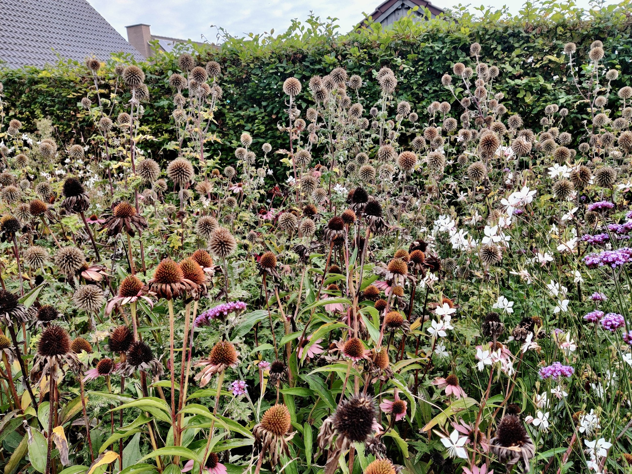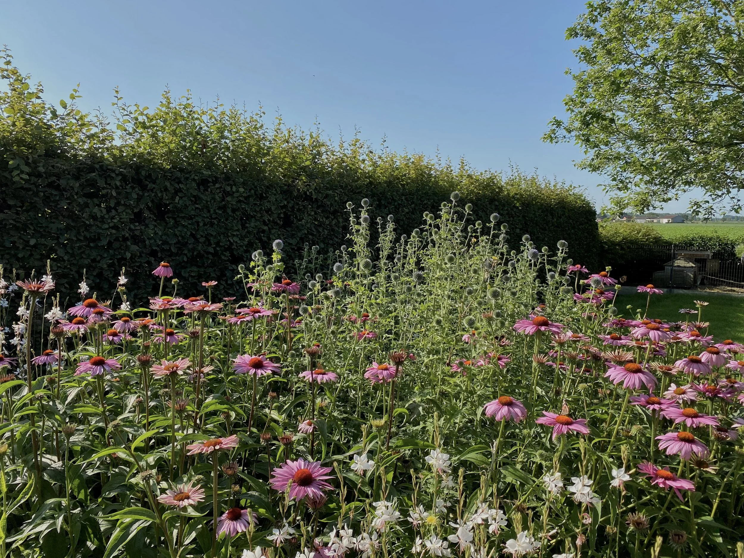 Het allereerste plantontwerp. Hiermee begon het allemaal. De combinatie van Echinacea en Echinops leek vanzelfsprekend en pakt enorm goed uit. Het kleur maar ook de bloeistructuren vullen elkaar perfect aan. Gaura en Verbena weven door het geheel en maakt alles wat losser. Deze border valt enorm in de smaak bij insecten!
