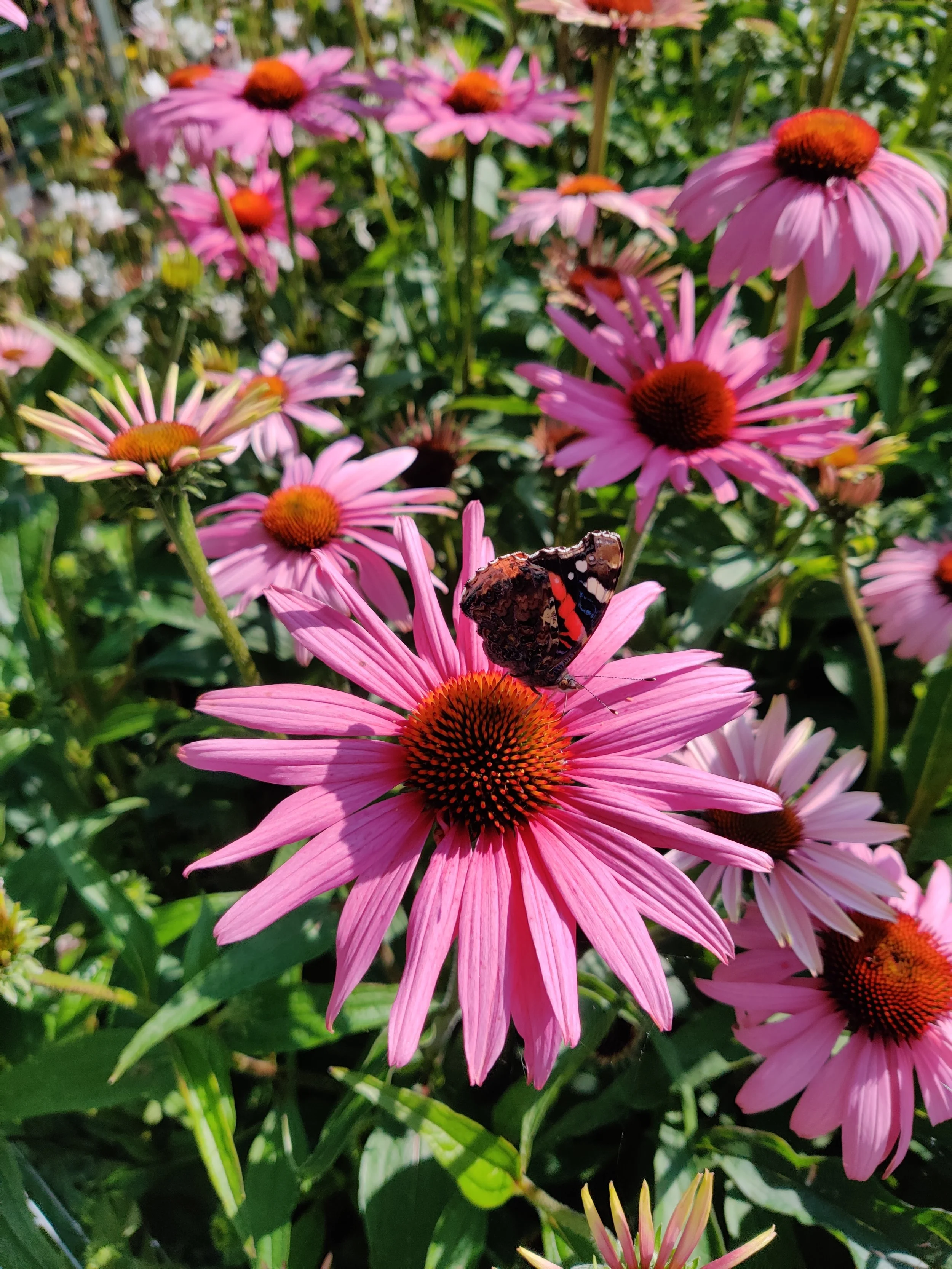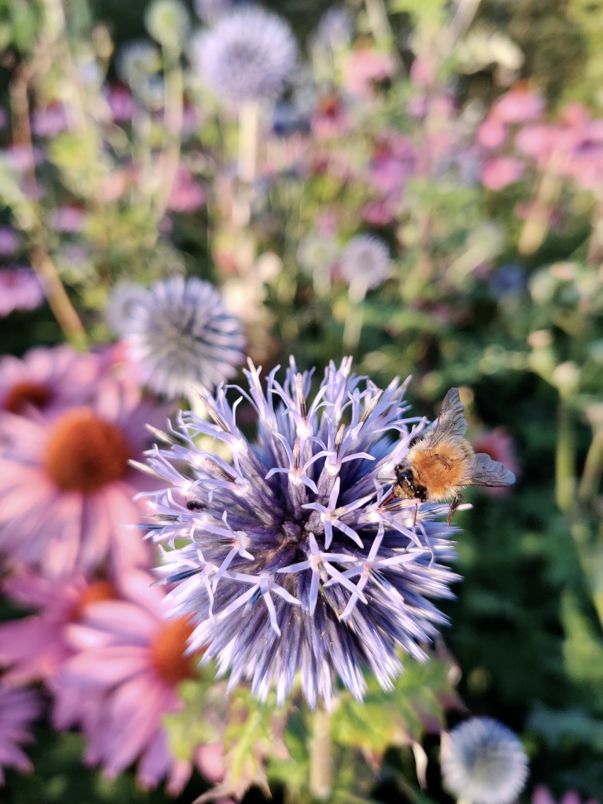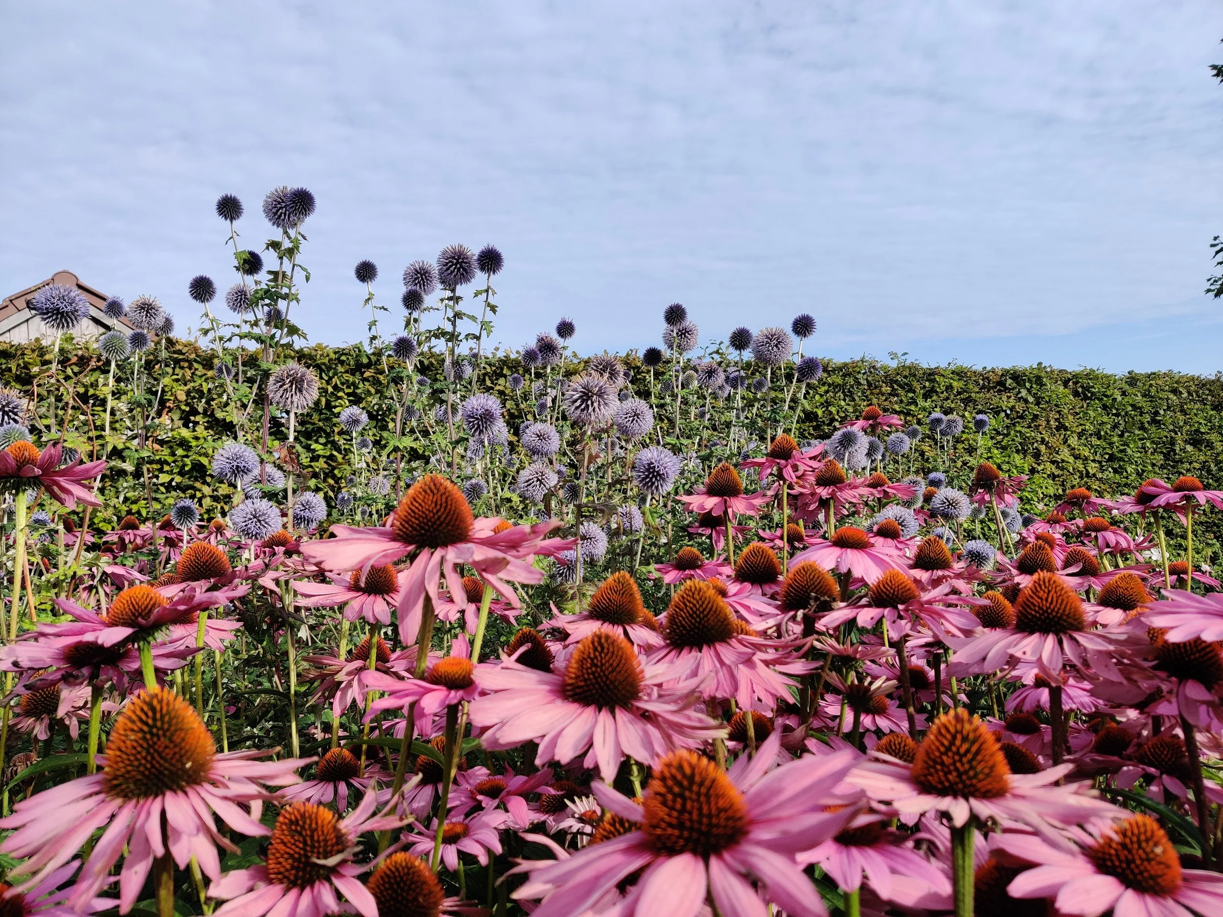 Echinacea en Echinops zijn ideale partners waarbij de bloemstructuren elkaar perfect aanvullen.